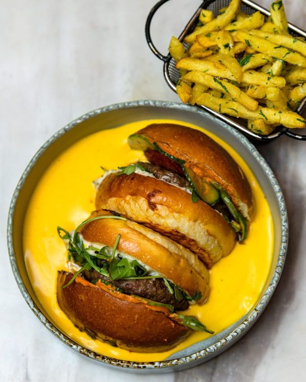 Juicy beef patty with chorizo, roasted kapia pepper cream, and parmesan fries.